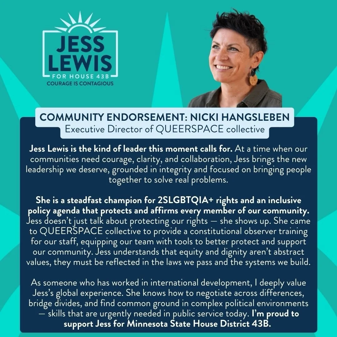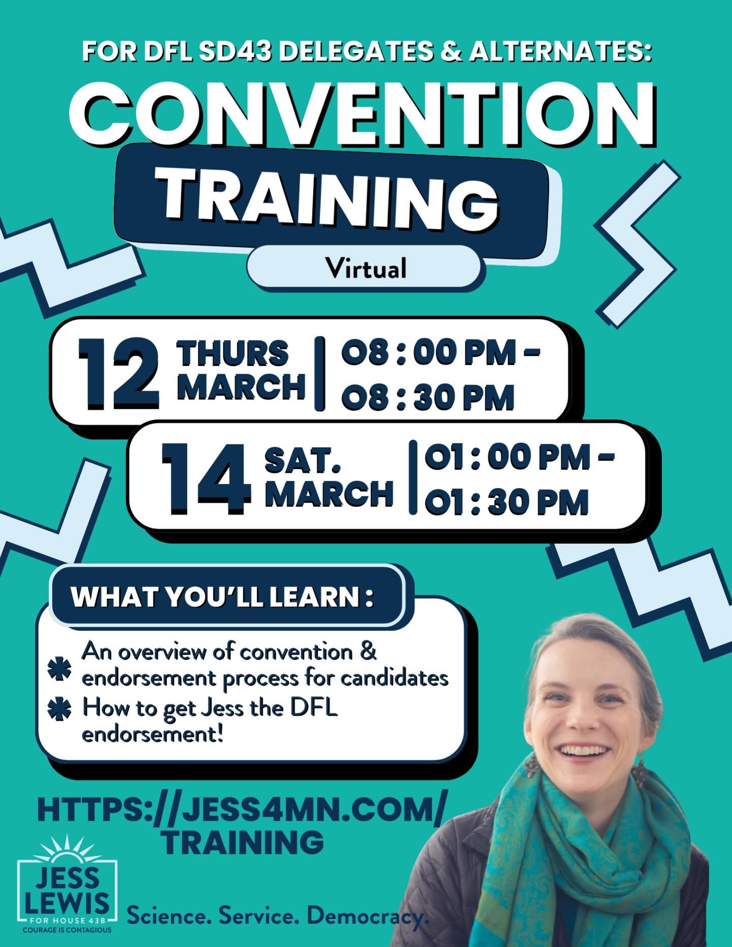 As a delegate, you'll have the power to help decide who receives the DFL endorsement for State House in District 43B. You must be a delegate or alternate (already determined at caucus) to vote for Jess! We're asking you to show up, speak up, and stand with Jess.